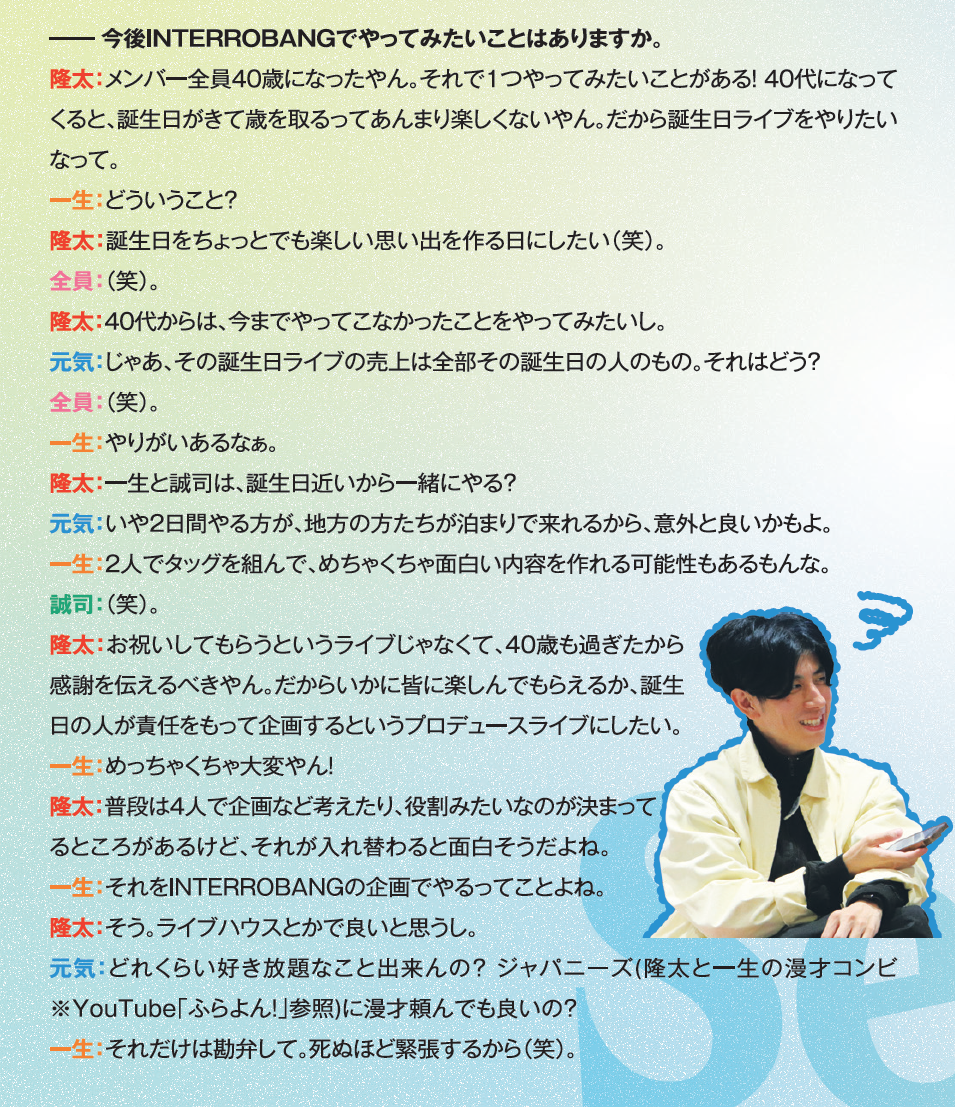 隆太:お祝いしてもらうというライブじゃなくて、40歳も過ぎたから感謝を伝えるべきやん。だからいかに皆に楽しんでもらえるか、誕生日の人が責任をもって企画するというプロデュースライブにしたい。